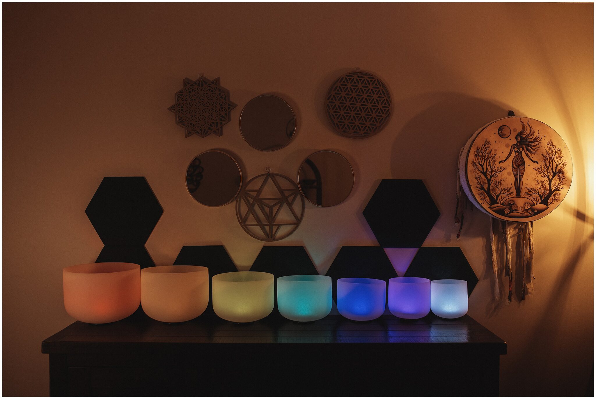 A professional branding image of crystal singing bowls used for sound healing at Spiral Quest Healing in Layton, Utah, captured to reflect calm, grounding, and intention.